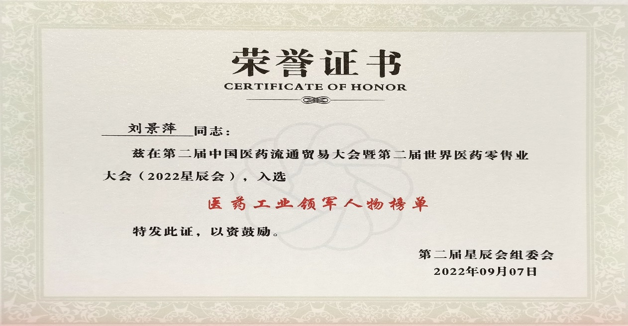本次星辰会期间,BG视讯斩获颇丰,获得多项行业奖项及荣誉。在开幕式上,刘景萍董事长荣获“医药工业领军人物”称号。